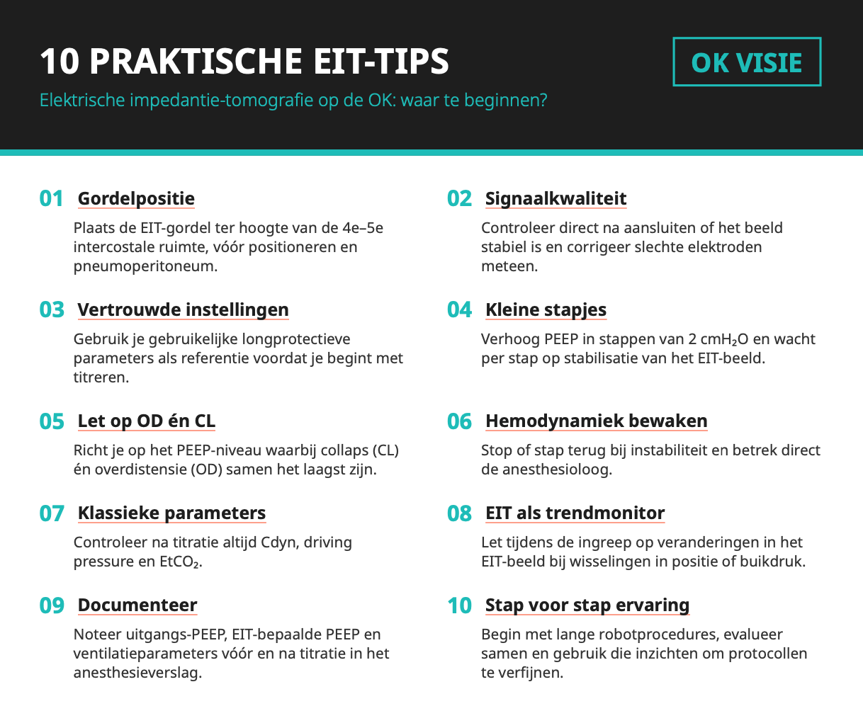 EIT vraagt om een aanvullende vaardigheid: het interpreteren van regionale ventilatiebeelden. Dat klinkt complex, maar in de dagelijkse praktijk is het principe eenvoudig: je ziet waar lucht wél en niet komt, en je titreert PEEP tot de verdeling zo gunstig mogelijk is. De studie bevestigt dat dit in de routinematige perioperatieve zorg goed haalbaar is, mits het team ervaring opbouwt en werkt met heldere afspraken. Sluit daarvoor aan bij collega's op de IC, die vaak al ervaring hebben met EIT, en begin met een beperkt aantal goed gekozen casussen.