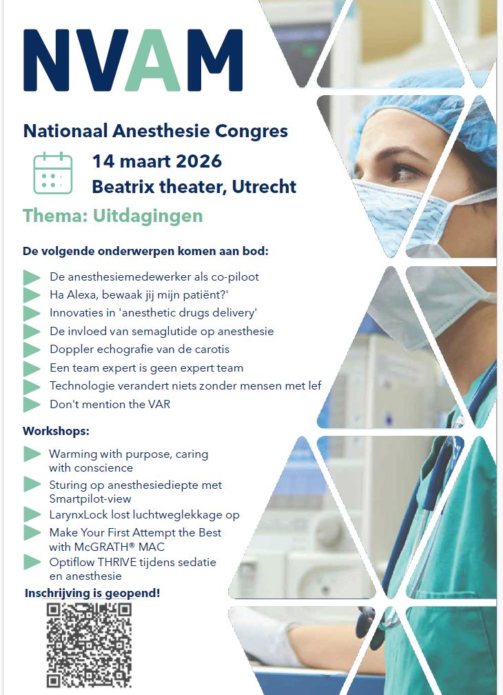 Op 14 maart aanstaande organiseert de NVAM het 41e Nationaal Anesthesiecongres in het Beatrix theater in Utrecht. De congrescommissie heeft het programma rond en in komend NTvA vindt u de eerste onderwerpen en sprekers.